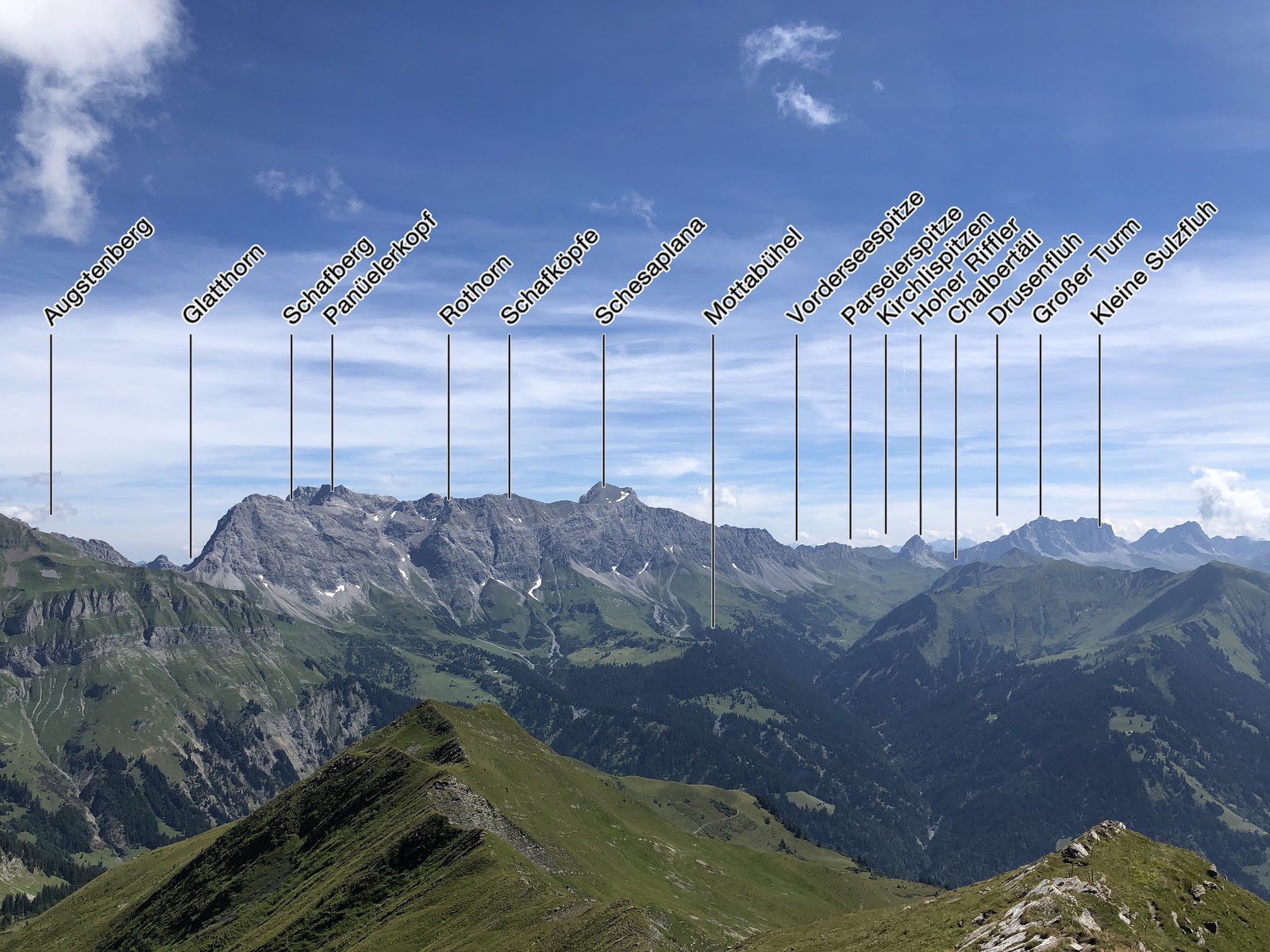 Gipfelpanorama vom Vilan – vom Falknis über die Schesaplana undsoweiter |