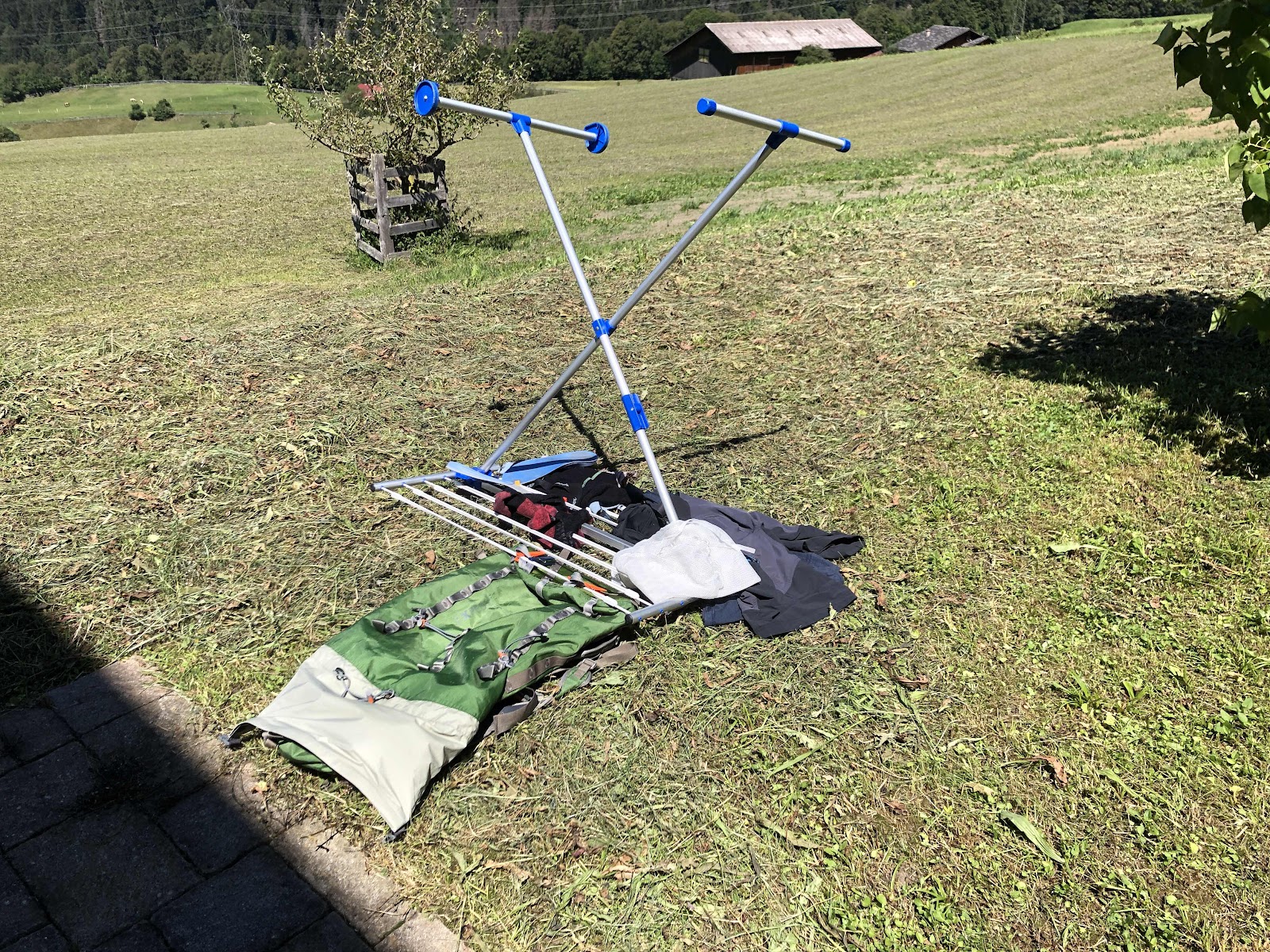 Nach der Gipfelrast steigen wir wieder ab und fahren retour nach Fideris. Den Zmittag geniessen wir, so wie den Rest des Tages, auf dem Sitzplatz. Schön am Schatten, mit leichtem Wind und sehr angenehmer Temperatur. Was für ein Genuss. Daneben wie erwähnt ein paar Servicearbeiten. So wie Wäsche waschen. Mit dem Test der neuen Trockenmethode nach Fideriser Art. Siehe Foto. Der Wind fand, dass der Wäscheständer nicht einfach so normal in der Landschaft herumstehen soll.