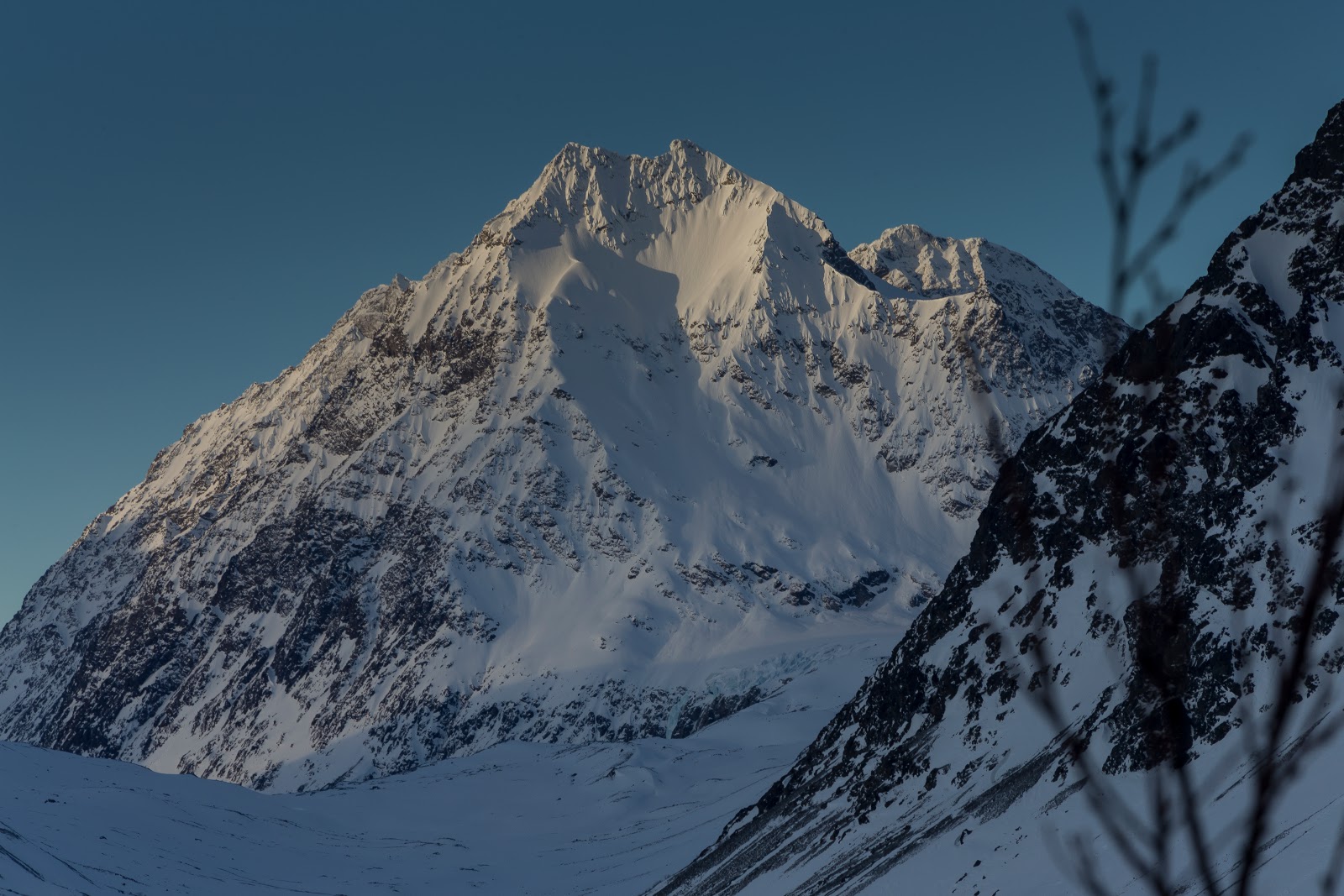 Den „Tvillingstinden“ sieht man immer wieder. Auch von ausserhalb der Lyngenalpen. Der Berg sieht sehr alpin aus. Dabei ist er „bloss“ 1437 Meter hoch. Direkt vor mir baut sich der nicht minder eindrückliche „Tafeltinden“ auf. Der ist eines der beliebtesten Skitourenziele der Lyngenalpen. Man besteigt in von der hinteren Seite her. Hinter dem „Tafeltinden“ erstrecken sich der „Koppangsbreen“ und der „Strupbreen“, zwei grössere Gletscher. Von diesen aus besteigt man diverse weitere bekannte Skitourenberge. Den Ausgangspunkt für diese Touren erreicht man meistens per Boot. Denn die Strasse endet in Koppangen. Für Skitouren vom Boot aus sind die Lyngenalpen bekannt. Viele Gipfel sind so abgelegen, da führt keine Strasse zu den Ausgangspunkten hin.