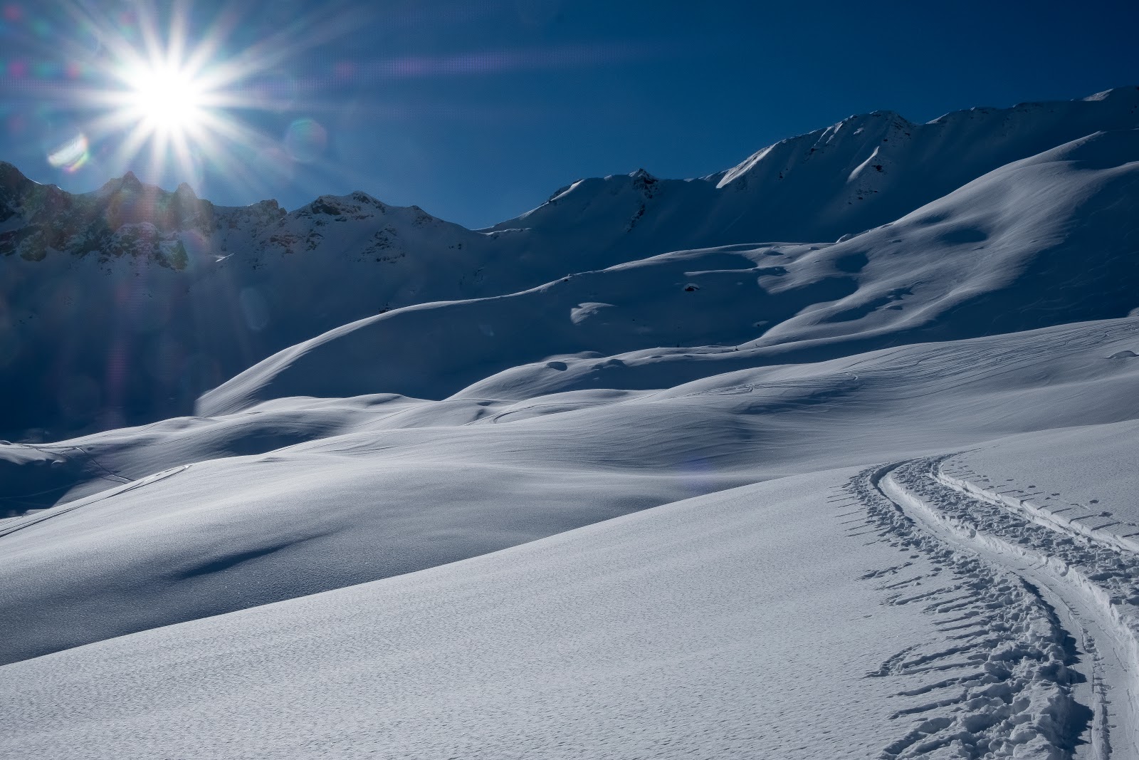 Stetig steigen wir auf, der Schnee wird sogar pulvrig. Bloss an einigen sehr exponierten Stellen, wo die Sonne voll hinbrennt, ist er hart und glasig. Die Schneemengen sind eindrucksvoll. Es liegt meterhoch von der weissen Masse herum.